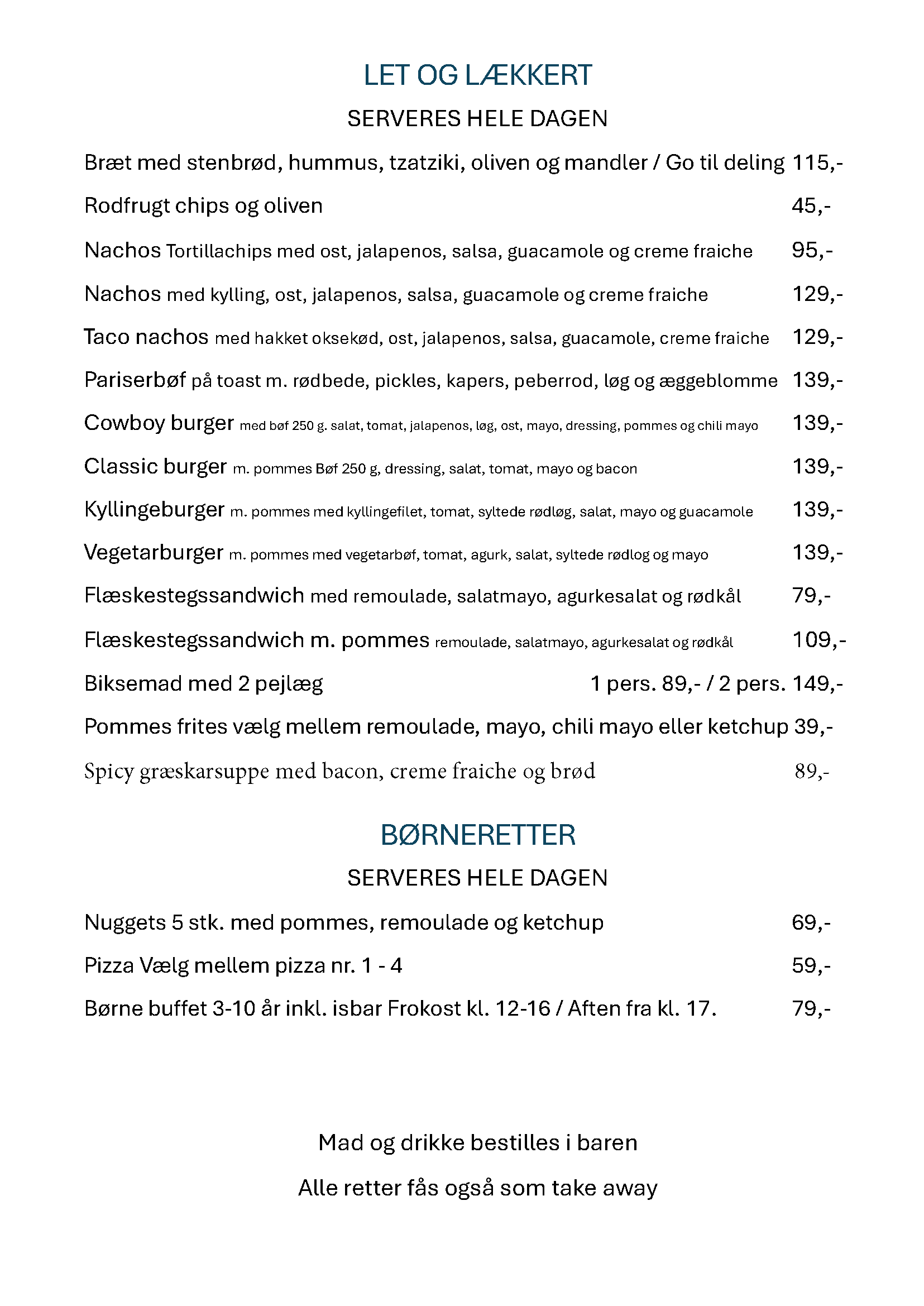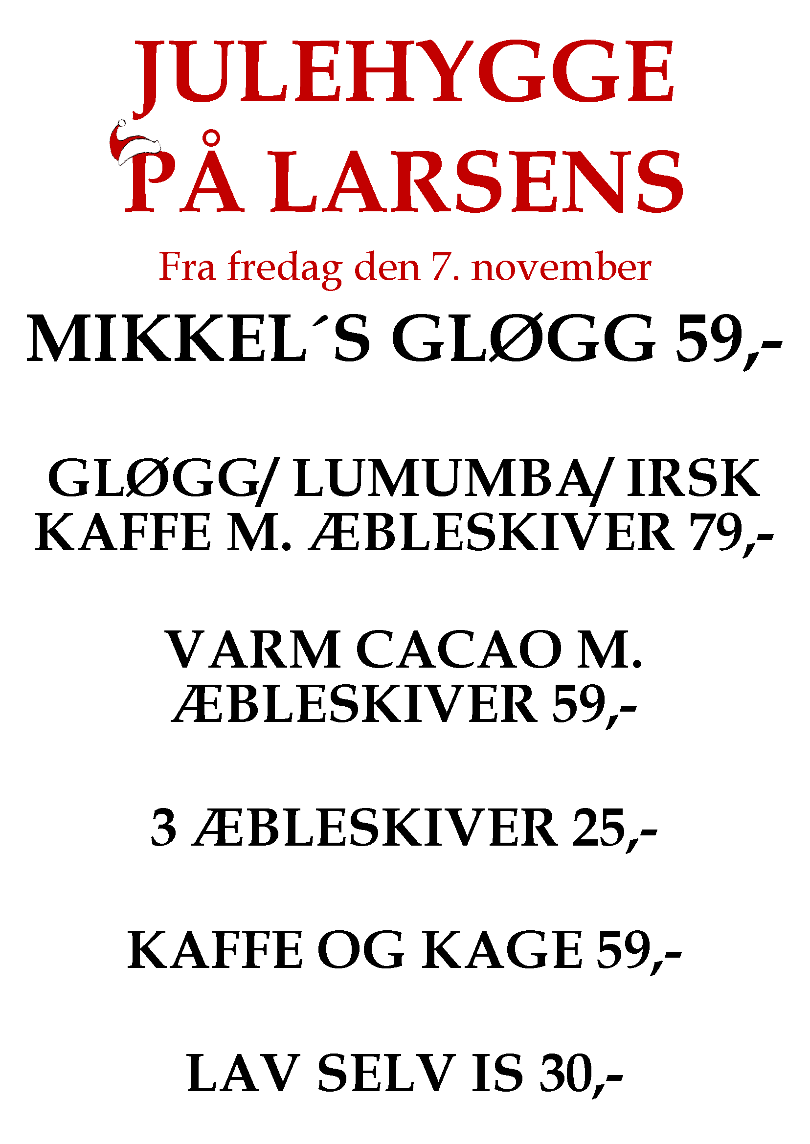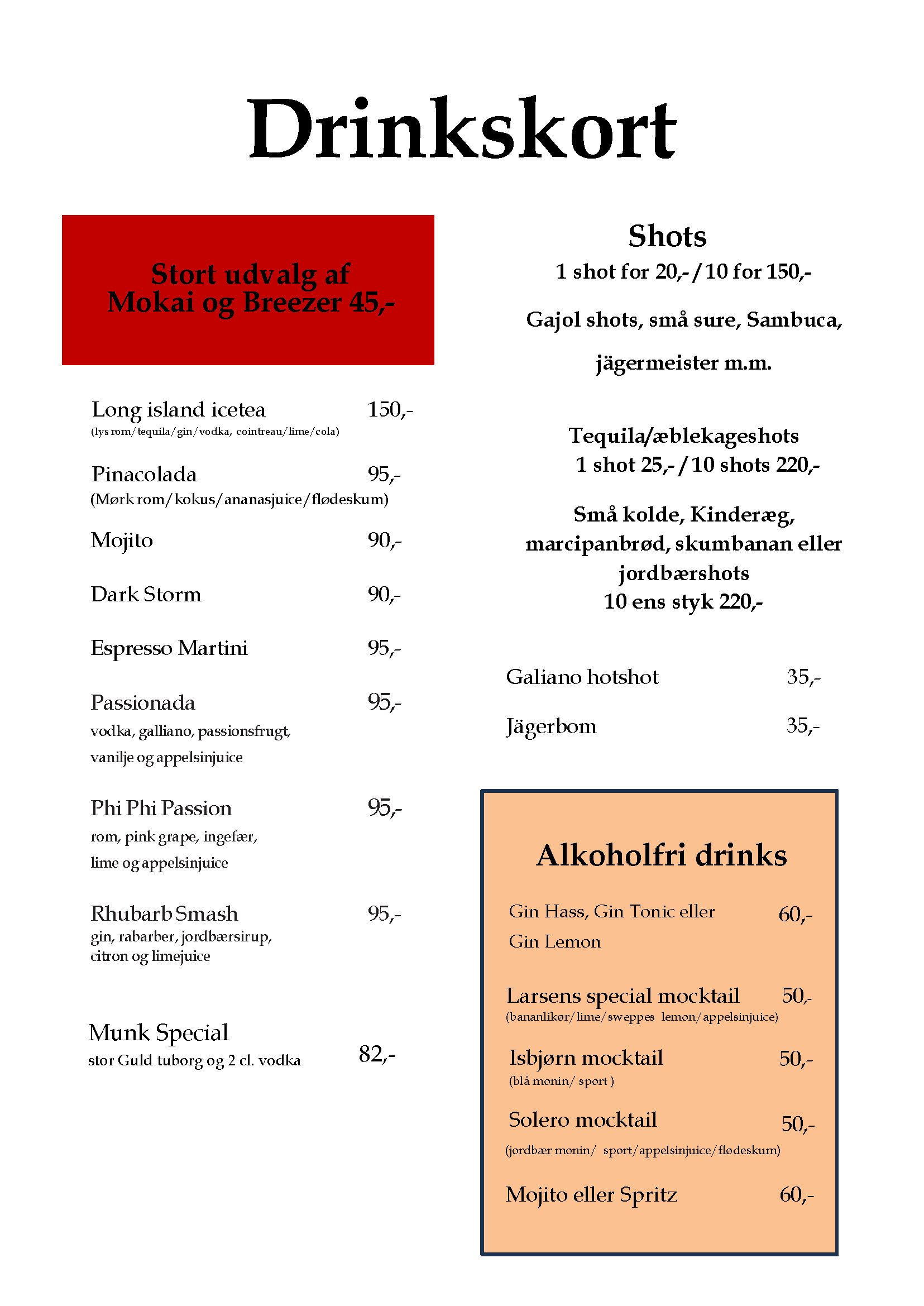 Menu Se vores menu Velkommen til Resaurant Larsens Plads Husk bestilling i baren HAPPY HOUR kl. 15.30-16.30 -Dobbelt op på fadøl, vin, sangria og GT HAPPY HOUR kl. 22.00-23.00 -Dobbelt op på fadøl, vin samt udvalgte drinks (se drinkskort)